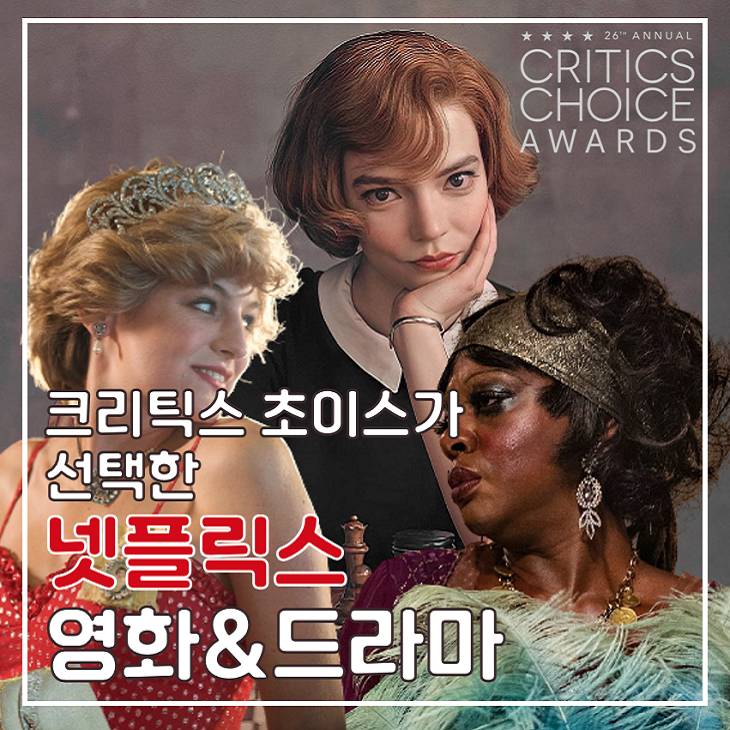 오늘은 어제(8일) 열렸던 2021년 제26회 크리틱스 초이스 시상식에서 수상에 성공한 넷플릭스 오리지널 영화 및 TV 프로그램을 마련하도록 하겠습니다.오늘은 몇 시간 전에 끝난 2021년 제26회 크리틱스 초이스 시상식 각 부문의 수상자를 정리해보겠습니다. …. blog.naver.com 코로나19로 인해 극장에서 개봉한 영화 수가 현저히 감소하고, 각종 시상식에서 그 어느 때보다 넷플릭스 영화의 인기가 돋보이고 있는 가운데 과연 넷플릭스의 어떤 작품이 크리틱스 초이스 시상식에서 수상의 기쁨을 누렸는지 지금부터 함께 살펴보겠습니다.