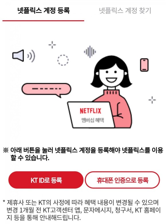 • 넷플릭스 베이식스 제공 – 만 19세 이상 개인고객 가입 가능 – KT 홈페이지 또는 고객센터 앱을 통한 인증 필수 – 미인증시 넷플릭스 이용료 9.500원 부과 – 넷플릭스 TV 시청료 베이식스 설명 동시접속 가능 명수 : 1인 콘텐츠 저장 가능 스마트기기 : 1인 콘텐츠 저장 가능 스마트기기 이용료 9.500원 부과 – 넷플릭스 TV이용료 9.500원 부과 – 넷플릭스 TV 시청용 TV프로그램 설명 동시접속 가능 명수 : 1인 콘텐츠 저장 가능 스마트 기기 : 1인 콘텐츠 저장 가능