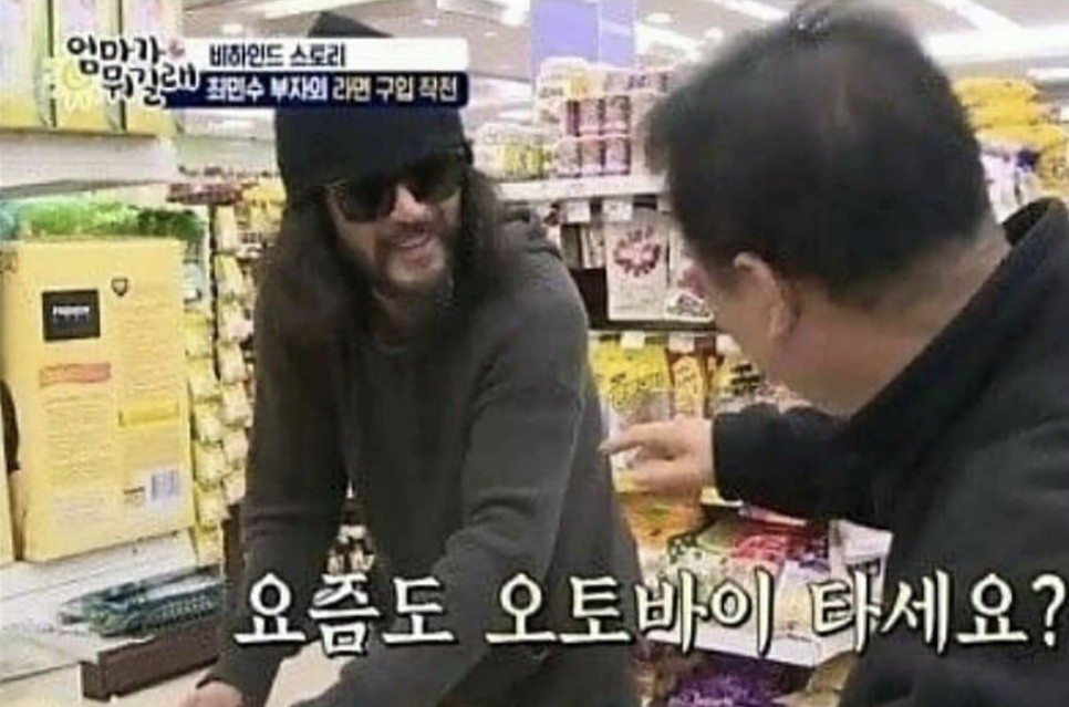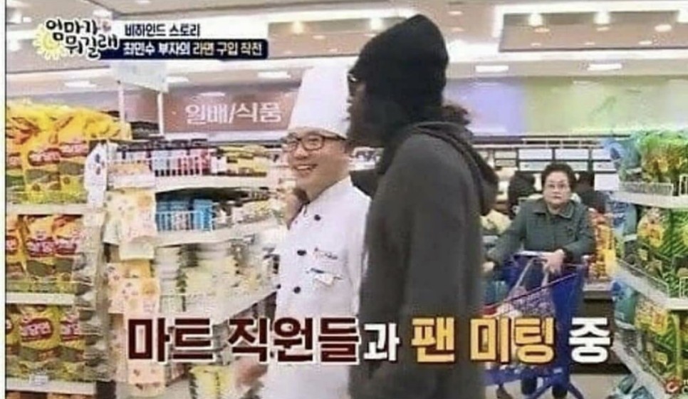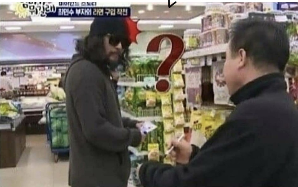 최민수 배우가 슈퍼에 쇼핑을 갔는데 종업원과 손님이 알아보고 사인과 함께 사진을 찍어달라고 부탁했다.