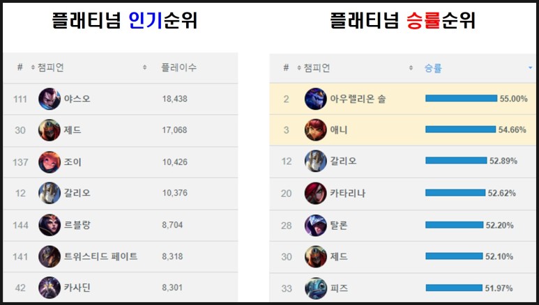 프라 구간의 인기 순위 상위에 조이가 새로 진입한 승률 순위에서는 아우솔이 1위로 새롭게 진입했습니다.상위티어로는 아우렐리온 소르가 높은 승률을 보이네요.
