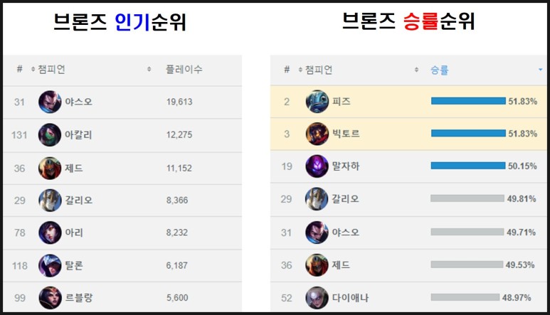 실버 구간의 인기 순위는 브론즈와 같고 승률 순위에서는 피즈만 1위로 갈리오와 제드가 진입했네요후후후