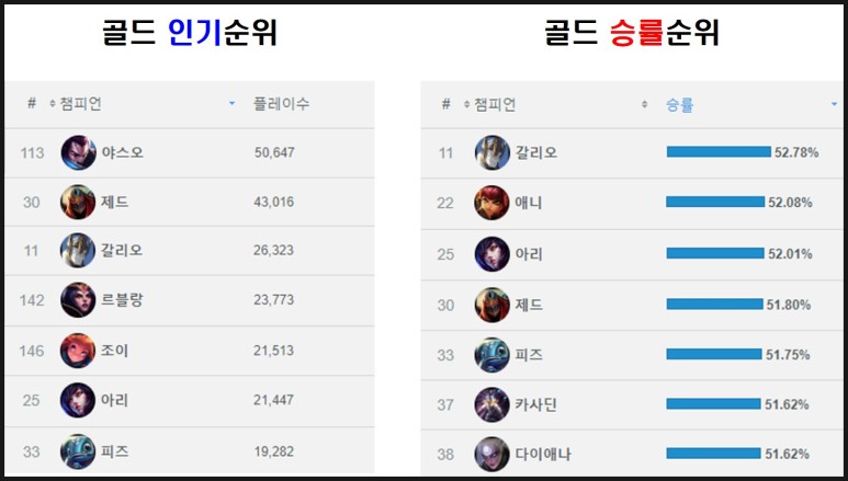 골드 구간의 인기 순위 상위권에는 갈리오가 새로 진입했습니다.승률 순위에서는 갈리오, 애니, 개미가 상위권을 차지했습니다.