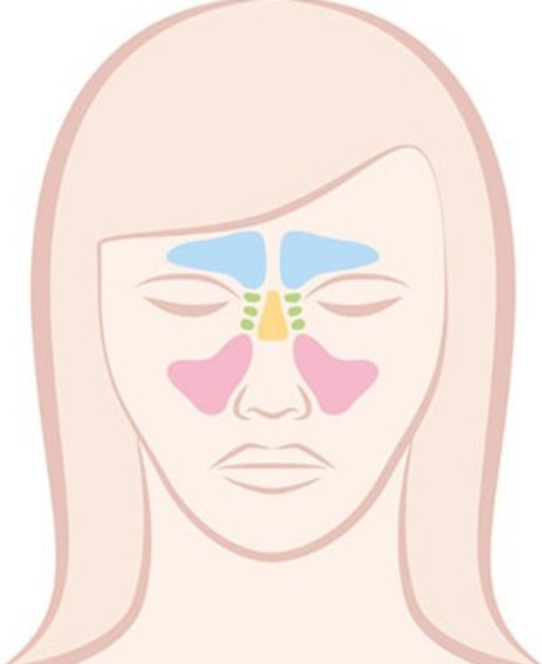 비강과 부비강을 연결하는 좁은 문과 같은 입구가 붓고 콧물이 제대로 순환되지 않으면 코와 눈 주위에 그림처럼 빈 공간이 있는데 비어 있어야 하는 분홍색과 하늘색 부분에 농도가 쌓이는 것을 부비강염(축농증)이라고 합니다.