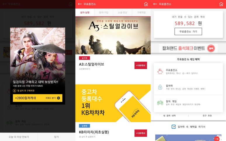 간혹 9680원짜리 봉투에 몇 백원이 모자라 1만원짜리 쿠폰을 못 사는 경우도 있다. 이 경우 무료 충전소를 이용하면 된다. 가벼운 모바일 게임 사전 예약부터 플레이까지 자신이 좋아하는 일을 하면서 포인트처럼 컬쳐 캐시를 얻을 수 있어 자주 애용한다.