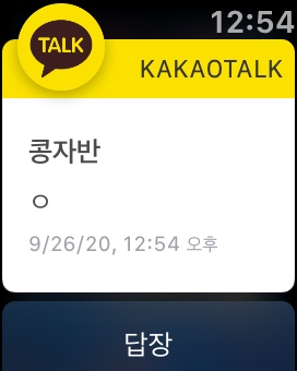 핸드폰에 카톡이 오면 이렇게 애플워치에도 진동+소리와 함께 카톡이 뜬다! 바로 회신도 가능하며 워치메뉴에서 카톡을 눌러도 회신가능