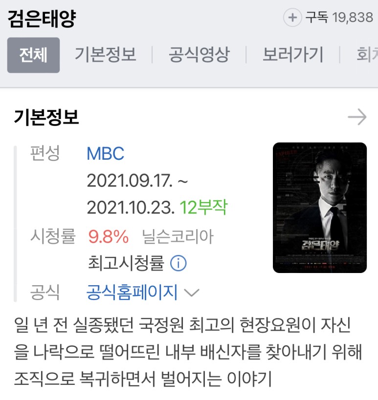 검은 태양 드라마 검은 태양 드라마의 기본 정보입니다.작년 9월에 편성된 12부작 드라마인데 처음 보니 아이리스 드라마가 생각났어요.(개인적인 생각) 이 드라마에서 남궁민 배우가 소나타를 타고 나왔어요.(웃음)