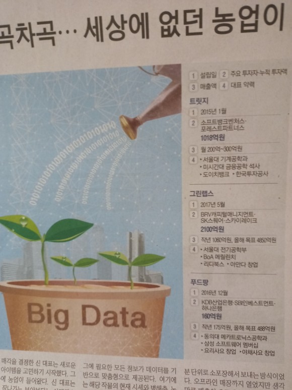 가계부 경제공부 🙂 무지하고 농업 플랫폼 한국 기업 트리와 자율주행 트랙터 존 디어 기사에 감동합니다. 매일경제)-한국 스타트업들이 새로운 비즈니스 모델을 창안하여 농업 플랫폼 분야에서 일대 혁명을 일으키고 있습니다. 그 핵심에는 빅 데이터가 있다. 농업 관련 데이터에서 새로운 시장과 고객을 창출하고 있는 것이다.트리 : 자체보유 세계농산물 산지, 작황, 가격 빅데이터를 활용하여 새로운 거래처를 알선한다. 제시된 산지와 물량, 가격을 바이어가 받아들이면 브릿지는 독자적으로 구축한 세계 물류망을 활용해 해당 유통식품업체에 새로운 농산물을 공급한다.- 그린랩스 : 디지털 농업 플랫폼으로 해당 작물의 현재 시세와 병해충, 농자재, 판로, 정부 보조금 등 모든 정보가 포함되어 농업인의 부가가치를 높인다.- 푸드팬 : 가락시장과 같은 공영도매시장에서 디지털 거래를 도입하여 중간상인들의 식재료 거래를 디지털화하는 작업을 한다.