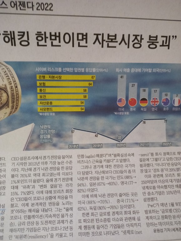 ▲ 가계부 경제공부 🙂 사이버 보안 위협 = 다보스 어젠다 2022 개막, 세계적 회계 컨설팅 회사 프라이스워터하우스쿠퍼스가 발표한 2022년 글로벌 CEO 설문조사 결과, 최대 글로벌 위협 요인 1) 사이버 리스크 2) 보건 리스크 3) 거시경제 불안정 4) 지정학 갈등 6) 사회적 불평등
