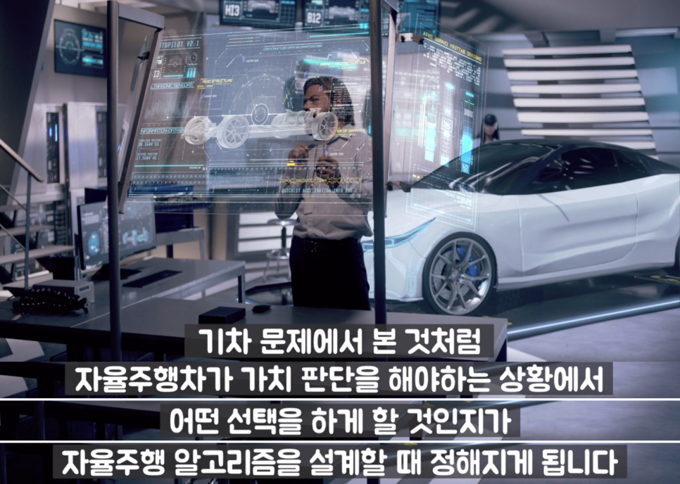 열차 문제에서 보았듯이 자율주행차가 가치 판단을 해야 하는 상황에서 어떤 선택을 할지가 자동운전 알고리즘을 설계할 때 결정됩니다.