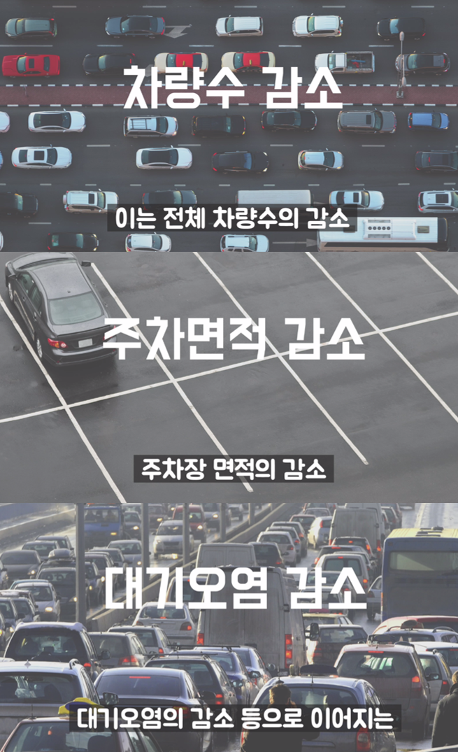이는 전체 차량 수 감소, 주차장 면적 감소, 대기오염 감소 등으로 이어지는 선순환 효과도 있습니다.