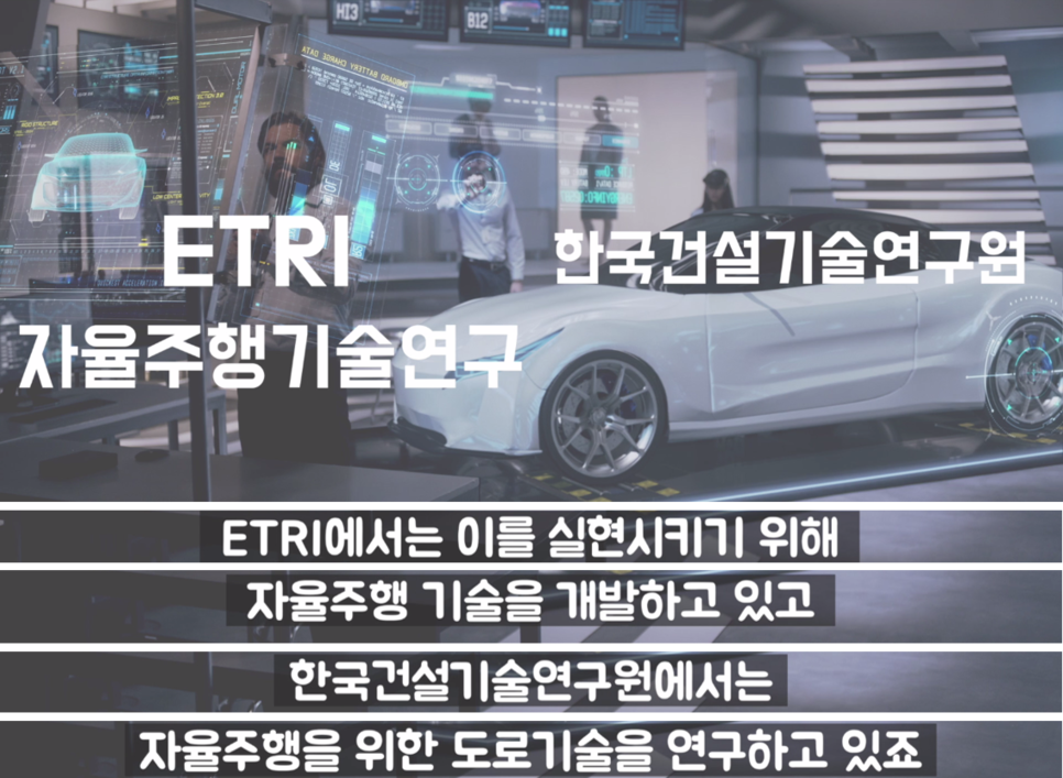 ETRI에서는 이를 실현하는 자율주행기술을 개발하고 있으며, 한국건설기술연구원에서는 자율주행을 위한 도로기술 연구를 수행하고 있습니다.