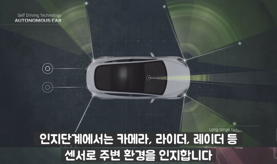 인지단계에서는 카메라, 라이더(LiDAR), 레이더(RADAR) 등의 센서로 주변환경을 인지합니다.