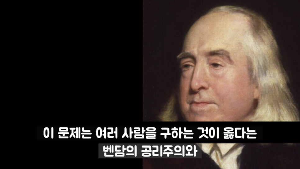 이 문제는 많은 사람을 구하는 것이 옳다는 벤담의 공리주의와 한 사람을 희생시켜서는 안 된다는 칸트의 의무주의 사이의 딜레마를 다루고 있는 것입니다.