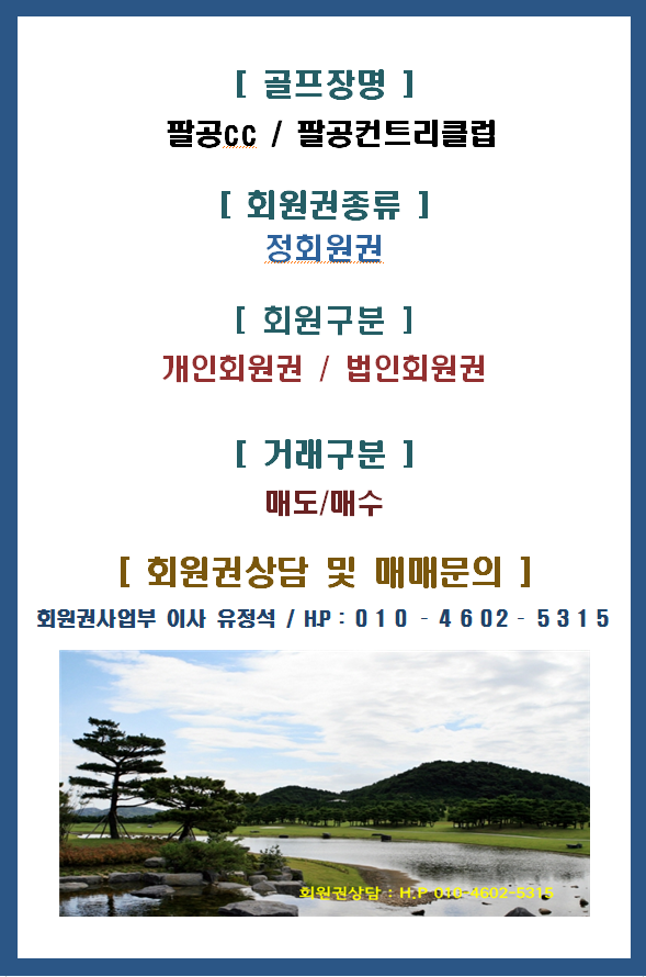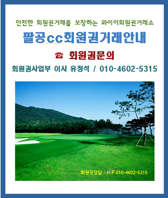 안녕하세요. <사단법인 한국골프회원권경영인협회> 정회원사 케이에스회원권거래소 박장한 과장입니다.오늘은 대구에 위치한 회원제 골프장인 팔공CC 골프회원권을 안내해 드립니다.