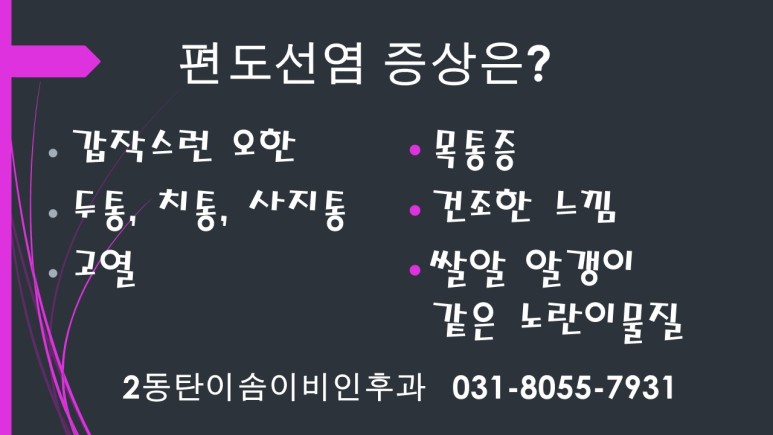 편도선염은 감기와 증상이 비슷할 수 있기 때문에 단순한 감기로 스스로 판단하여 처방전 없이 약을 복용하는 경우가 있는데, 이 경우 증상이 호전되지 않고 증상이 오래 지속될 수 있습니다. 이동탄의 이비인후과에서 정확한 진단을 받아보길 권합니다. 편도선염은 처음부터 고열이 시작될 수 있으며, 해열제를 복용해도 금방 열이 내려가지 않을 수 있습니다.