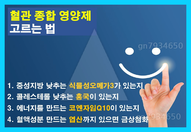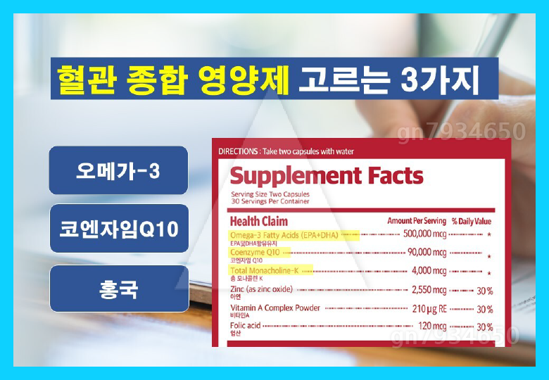 이들 세 가지 성분 오메가3, 홍국, 코큐텐을 함유한 복합 영양제는 이미 약국에서도 혈관 종합 영양제로 유명합니다.
