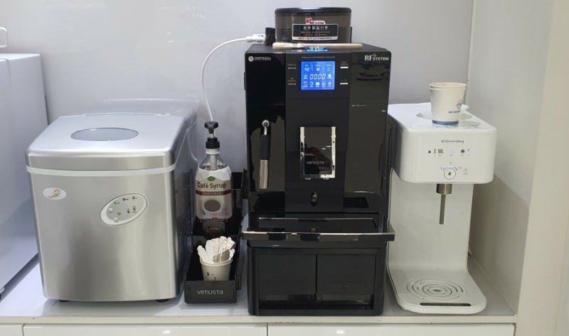 새로 바뀐 로비에 어울리는 물병을 올려 쓰던 것을 김해커피머신 렌탈 같은 회사 제품으로 정수기까지 한 번에 대여했습니다.한번씩 고객님 물이 안나와요.그러면 물티슈로 닦고 무거운 물통을 올리는 번거로움이 없어져서 굉장히 편하실 거예요.ㅎㅎ 같이 있어야 하는 이유는 워터볼탑만 연결하면 커피머신에 물을 따로 채워 사용할 필요가 없기 때문에 이런 식으로 사용하면 자동급수가 되어 마음대로 이용할 수 있기 때문입니다.^^ 별거 아닌 것 같지만 커피머신기 하나가 직원들의 아침을 활기차게 하는 것 같아요.각자 취향에 맞게 원두향 가득한 커피 한잔에 다들 너무 좋아하시고 사무실 냄새도 은은한 커피향이 퍼져서 좋아요~