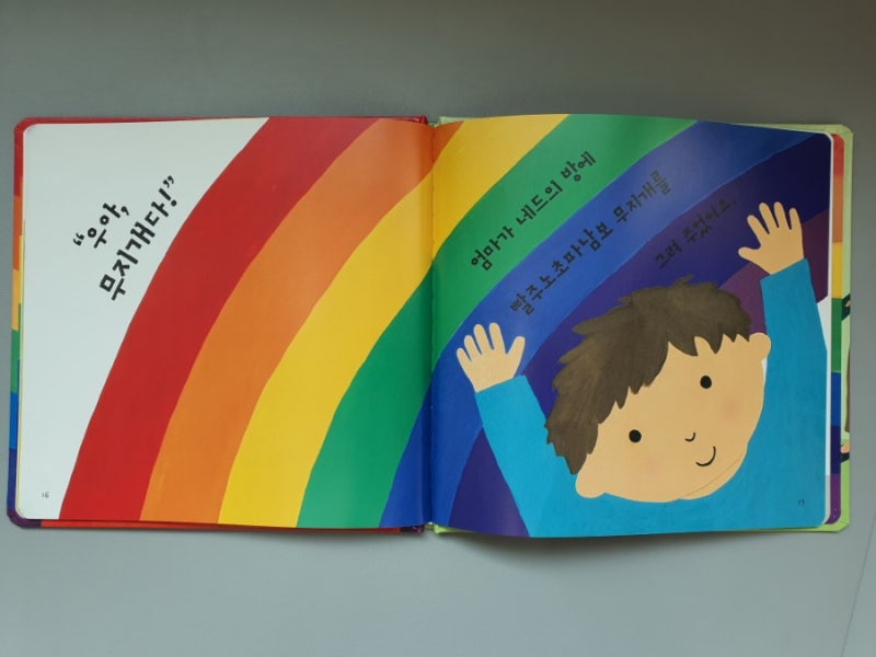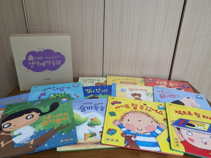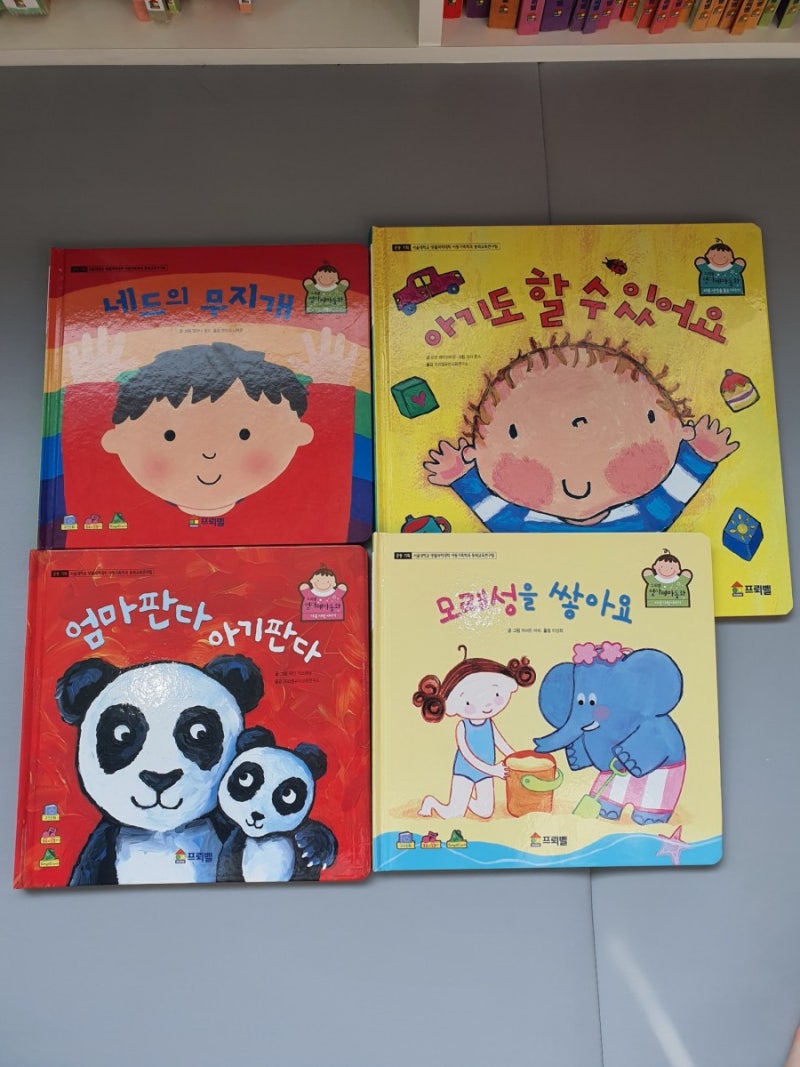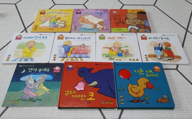 50권이나 있어서 한권 한권 다 자세히 사진은 못찍고 몇장만 찍어서 보여드릴게요.아기를 읽을 수 있는 수준의 책도 많고, 두 돌 정도로 적당한 책도 있습니다.내용상 새돌까지는 읽어줄 수 있는 책도 있습니다. 1) 우리아이 까꿍보드북에서 담요 소재의 천이 붙어 있는 일종의 촉감 책입니다.아기가 보기 쉬운 수준으로 까꿍놀이나 신체 부위의 명칭을 알 수 있는 책입니다. 2) 엘보의 긴 코코끼리 엘보가 긴 코로 사고를 내고 의기소침해지면 다른 동물들이 긴 코로 도와준다고 말해줍니다.얇은 보드북이지만 당기는 조작북에 입체적인 느낌의 팝업북 스타일로 되어 있습니다.근데 중고책이라 <엘보 긴 아이>랑 <건강해 둘리야!> 이런 조작북 팝업북은 상태가 안 좋죠.마지막 페이지가 이렇게 다 벗겨지지 않았네요. (울음) 아마 좋아하는 책이라서 그런가봐요. 대충 내가 검색해서 찾은 이미지를 프린트해서 붙여줘야지 – 생각만 하고 아직 실천은 안 했어요제가 정말 좋아요.처음에는 작은 책이 전부 보드북인 줄 알았는데 사실 세 번째부터 얇은 종이 재질의 하드커버가 나옵니다.양장본이 뒷번호도 아니고 이렇게 섞여있네요.책의 내용은 다 잘 못해도 이대로 사랑받을 수 있다는 긍정적인 내용입니다. 4) 룰라는 너무 엉뚱해역시 얇은 종이 재질의 하드커버입니다. 말썽꾸러기 강아지 로라가 말썽을 부려도 모두 사랑스러운 로라를 사랑한다는 내용입니다. 5.사랑해주세요양장본이지만 전개본입니다. 열어보는 일종의 플랩북.내용은 매우 단순합니다. 아기 수준…아기가 졸리고 배고프고 심심하면 가족이 함께 한다는 내용입니다. 6) 아빠랑 근질근질해보드북으로 돌기 좋은 책이에요.마찬가지로 매우 내용이 단순합니다. 아버지가 여기저기 간지럽히는 내용인데 신체 부위를 알 수 있어요. 7. 안아주세요이 책도 보드북입니다. 내용이 다 비슷하네요.그래서 처음에는 조금 사놓고 실망했어요.아버지와 함께 목욕을 합니다.이것도 비슷한 보드북인데 아빠와 아기가 목욕을 하는 내용입니다.앞부분 책들 대부분 애착 형성에 관한 내용인 것 같아요. 9. 엄마팬더 아기팬더이 책은 얇은 양장본이네요.엄마의 아기는 다르지만 함께 있으면 행복하다는 내용입니다.같은 점과 다른 점에 대해 알 수 있습니다. 10. 내 아이 바쁜 아기비슷한 내용의 보드북이 또 있네요.아기가 하루 종일 장난감을 가지고 노는 행동을 볼 수 있어요.역시 돌아기가 보기 쉬운 내용이네요. 유치원을 좋아합니다.보드북인데 유치원에 가서 적응하는 아기의 내용입니다.유치원이라는 말 대신 ‘어린이집’으로 바꿔서 읽어줬어요.이건 1살이 되기는 어려울 것 같아요. 2달러~3달러 내용으로 적당할 것 같습니다. 12. 아빠 생일 축하해요!양장본, 플랩북 당나귀 아버지가 생일을 맞이하여 생일파티를 준비하는 내용입니다.13. 오늘은 이사가는 날양장본으로 신혼집으로 이사를 가는 과정을 보여주는 그림책입니다.새로운 친구들도 만나고 이사의 의미를 알게 됩니다. 14.테드와 숨바꼭질양장 플랩북입니다. 이런 전개의 책도 의외로 많네요.얇은 종이 재질이기 때문에 서랍처럼 당기는 것은 찢어지기 쉬울 것입니다.애착인형 테드를 찾는 내용입니다. 15. 뽀삐야, 어디 있어?보드북인데 똑같이 애착인형 뽀삐를 찾는 내용입니다.소파 위나 침대 아래 등의 위치를 알려주기도 합니다. 16. 사이좋게 놀아요.양장본으로, 플랩북(넓은 책)입니다.당나귀 아빠가 또 나오네요. 친구들과 사이좋게 노는 내용입니다.17. 나랑 놀자!양장본에서 새로 온 반점이 있는 고양이가 마음에 들지 않았던 고양이가 결국 마음을 열고 다 같이 놀게 된다는 내용입니다.새로운 친구들과 노는 방법을 알려주네요. 18. 새로운 친구가 생겼어요!양장본인데 오늘은 이사의 날 책 같은 작가네요.새로 이사온 친구와 싸우자마자 서로 친하게 지내는 내용입니다.이렇게 세 권이 같은 책이네요. 19. 힘내 두리!<엘보의 긴 코>와 함께 자주 언급되는 <건강 두리!> 비슷한 스타일의 얇은 보드북 같은 조작북입니다.슬픈 오리 두리를 위해 친구들이 이것저것 해주지만 결국 두리가 원했던 것은 따뜻한 포옹이었습니다.이 책도 마지막 장이 울었네요.얇은 팝업이라 잘 찢어지는 것 같아요. 고지와 고티는 친구양장본으로 우리 아기가 관심을 가지고 읽고 있는 책 중 하나입니다.오리 아기가 아니라 거위 아기인 게 재밌는 것 같아요. 이 책에서 우리 아기가 ‘거위’라는 말을 알게 되었어요. 21.새로운 친구 올리마찬가지로 하드커버로 <고지와 고티는 친구>에 이어 고지와 고티가 다시 나옵니다.하지만 <새 친구 올리>가 훨씬 좋아요.계란이 나오고 찰싹찰싹한 부분도 좋아해요. “그럼 나오지 마!”라고 내가 읽으면 아기가 “그래! 나오지 마!”라고 하네요.(웃음) 레오는 정원사보드북으로 아기에게 딱 맞는 내용입니다.아기 레오가 나오는 책입니다. 여기서도 뽀삐가 나오네요. 23. 가을 나들이양장본으로 가을날 아기가 할 수 있는 산책과 다양한 활동을 볼 수 있습니다.자연관찰에 관한 내용이기도 합니다. 24. 네드의 무지개양장본으로 무지개를 좋아하는 아이에 대한 내용입니다. 엄마가 아이를 위해 