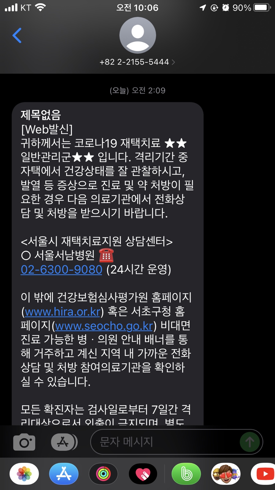 이른 아침에 재택치료 일반관리군의 안내 문자를 받는다.서울서남병원 02-6300-9080 비대면 진료 후 약 처방을 받기 위해 전화하고,