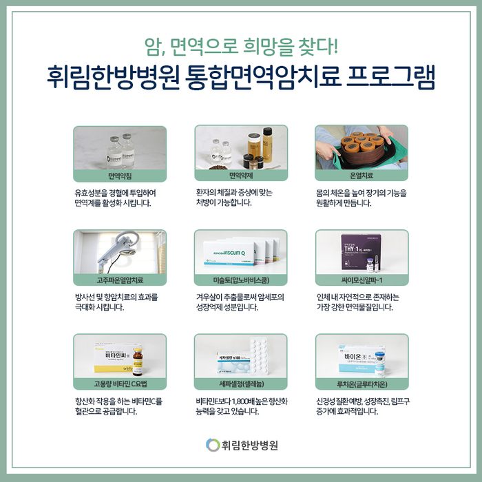 이 통합면역암 치료는 통합종양학에 입각하여 한방과 서양의 면역치료를 병행하여 표준암치료에 대한 반응도를 높이고 장기간 이루어지는 치료를 무사히 마칠 수 있도록 항암환경에서 구축하기 위하여 이루어집니다.