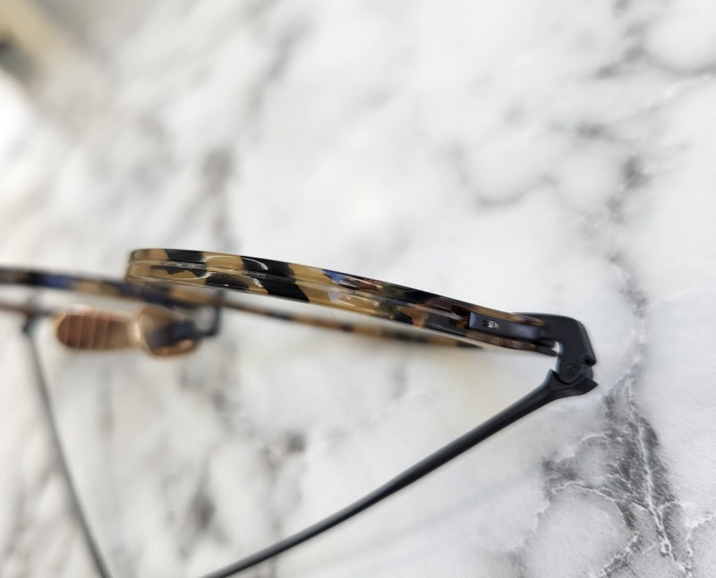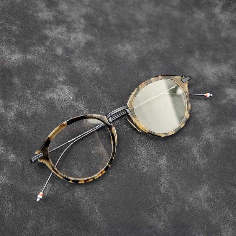 톰브라운안경의 독특한 매력이 곳곳에 보이는데, 일반 콤비형 안경테와는 달리 아세테이트림을 고정시키는 방식이 반테두리처럼 윗부분에는 티타늄, 그리고 하부림에는 나일론 끈을 이용해 고정한 모습입니다 기술력과 디테일 그리고 디자인까지 최고인 역시 톰브라운안경답네요:ㅇ