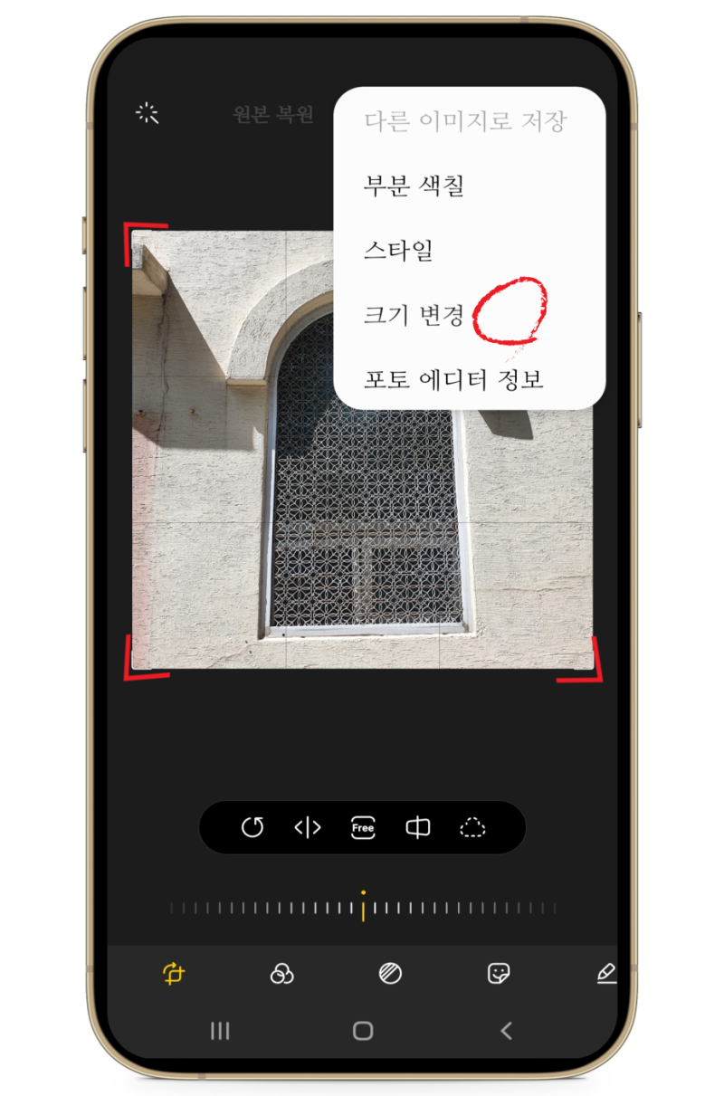 선택을 몇 번 하면 마법처럼 과정이 진행되는데 너무 신기했어요.일단 핸드폰으로 앨범에 들어가신 상태에서 원하시는 이미지를 골라주세요.그럼 위와 같은 화면이 나올텐데요.여기서 두 번째에 위치한 연필형 아이콘을 클릭하세요.