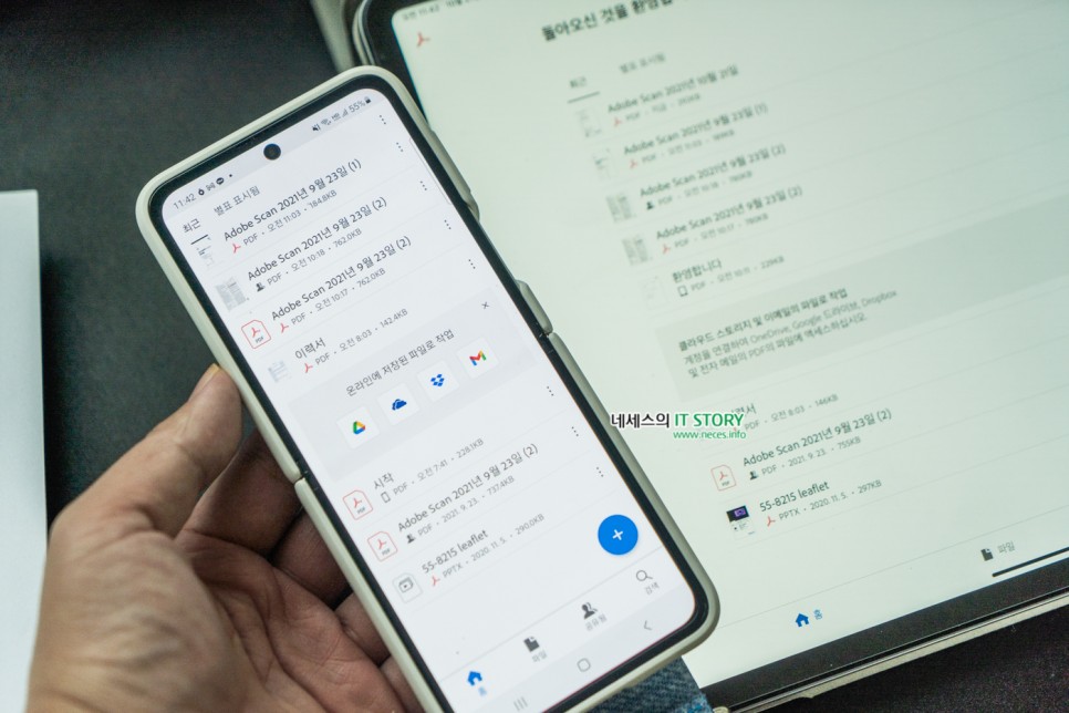 그리고 이렇게 공유되는 파일은 어도비 크리에이티브 클라우드 공간에 업로드 되기 때문에 스마트폰은 물론 태블릿 PC에서도 파일을 옮기지 않고 어디서나 확인하고 작업할 수 있습니다. 이동 중에는 스마트폰, 집이나 도서관 작업실에서는 PC나 태블릿으로 쉽게 작업할 수 있습니다.