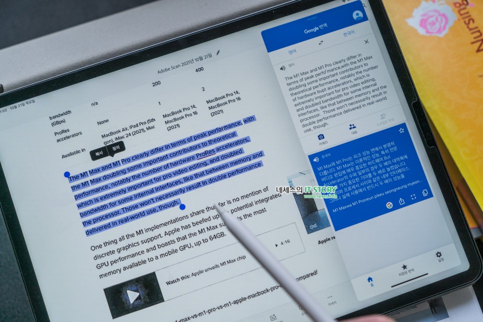 이렇게 저장된 PDF는 단순한 화상으로 저장되는 것이 아니라 OCR이 작동하여 텍스트를 인식하여 저장됩니다. 스캔 한 PDF 의 문자의 일부분을 텍스트로 보존할 수도 있고, 이렇게 문장을 드래그 해서 번역기에 넣어서 바로 번역해 보는 것도 가능합니다.