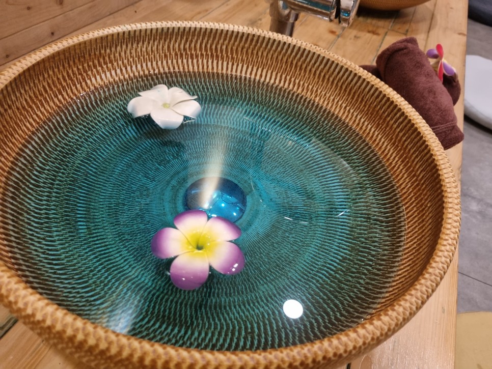 이렇게 예쁜 꽃 모양의 조형물도 띄운 건데 마사지 전후에 손과 발을 깨끗이 씻겨주더라고요