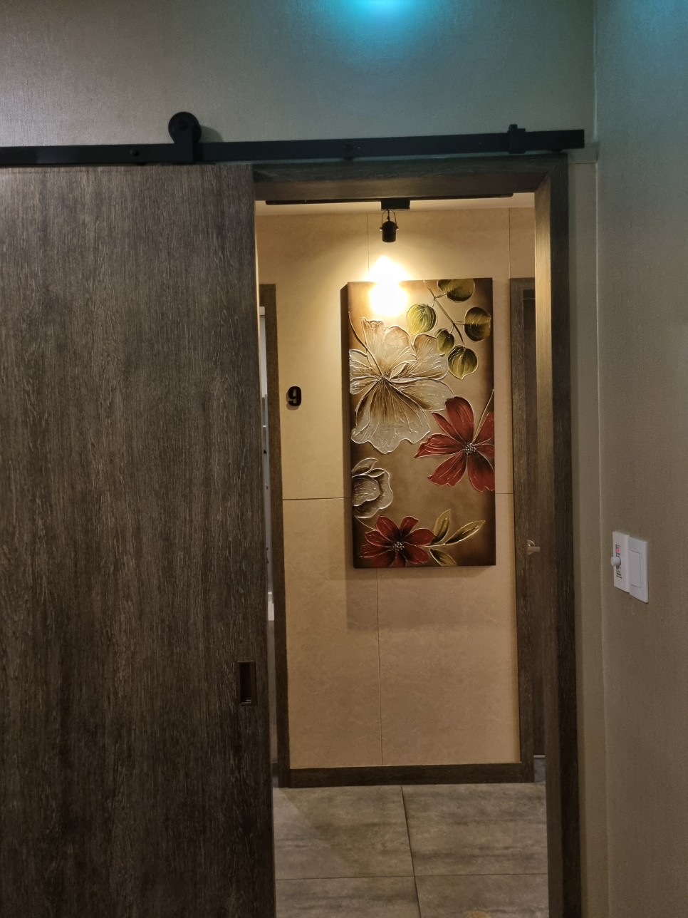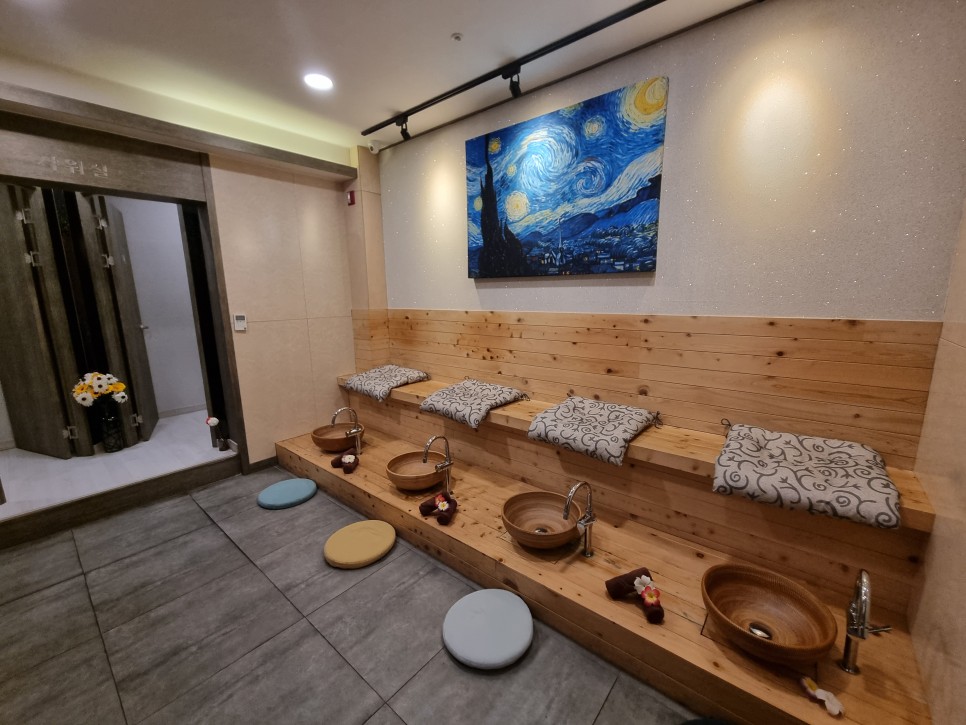 샤워실 입구 사진인데 벽에 걸린 벽화가 마음에 들어서 사진을 찍어봤어요.