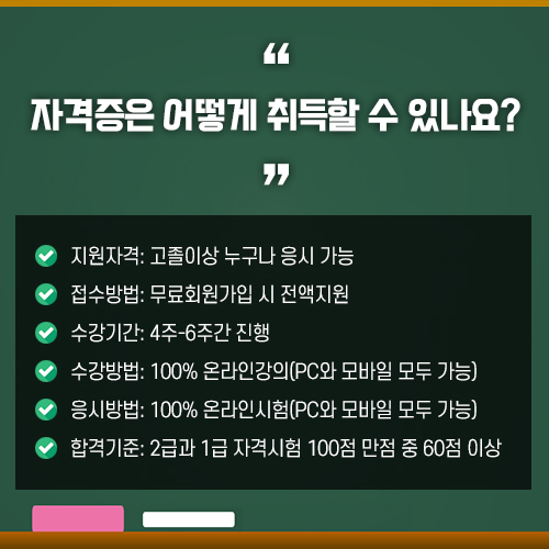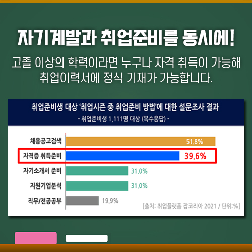 고졸 이상의 학력이면 누구나 자격증 취득이 가능하고 취업 이력서나 자기소개서에 정식 기재가 가능하며