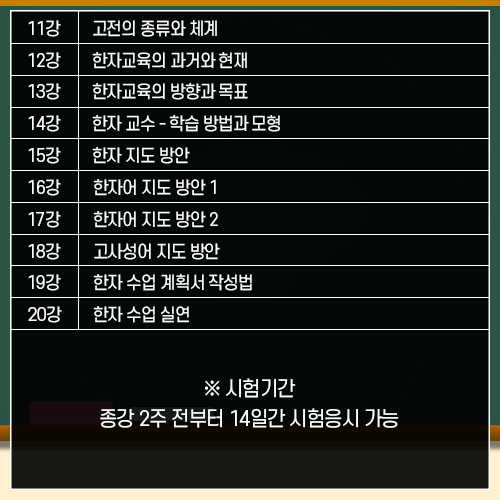 강의는 어떻게 진행됩니까?한자교육지도사 과정은 과정별로 20개의 강의로 구성되어 있으며 100% 온라인 강의와 온라인 자격시험으로 컴퓨터와 스마트폰으로 언제 어디서나 자유롭게 강의 수강이 가능합니다!
