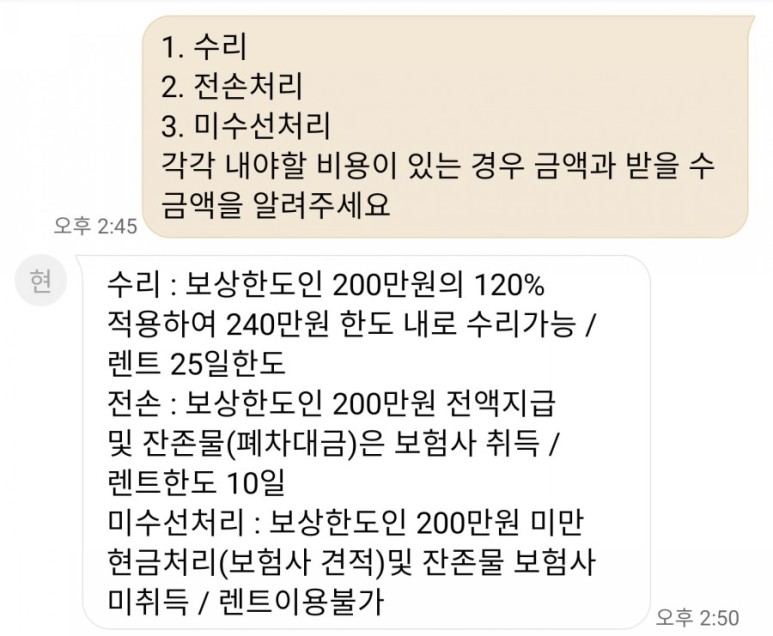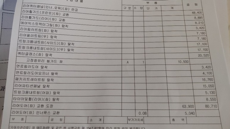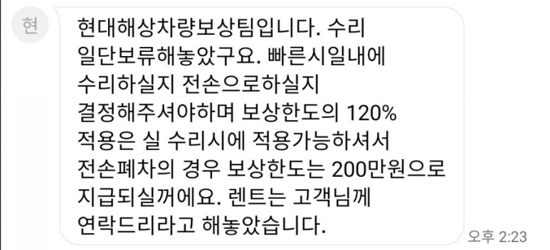 자동차 수리는 사고 번호가 있기 때문에 자동차 등록증을 주고 원하는 곳에 맡기면 되므로 자동차 수리회사에 요청하거나 상대 보험회사에 요청하면 바로 나온다.자동차 수리는 20일 걸리고, 실제로 10일 정도 걸리는 문제는 자동차 수리 견적이 280인데, 내 차가 낡아서 차를 폐차할지 추가금을 내가 내고 수리할지 결정하세요.100% 과일인데 수리비를?이 문제로 고개를 갸웃거리다가 200엔 금방 굴러가는 차를 팔아 다른 차를 살 수도 없고, 수리비를 물다니 분하다. 갑자기 폐차?? 아니면 수리비를 일부 부담하라고?? 이때 카센터는 금액을 공장가격으로 부르고 현대는 예상 수리비용을 불러 서로 가격을 따로 불러 재차 확인했다.결론은 내 차는 연식이 길어 120%가 아니라 130%도 가능하다는 것을 디비로 확인한 뒤 얘기하면 현대는 수리비를 260에 맞춰 부담해야 한다는 것이다. 공장가/예상 수리비용이 틀리지 않아 계산 안 했으면 돈을 내라고 했을 텐데 #전손처리 #미수선처리