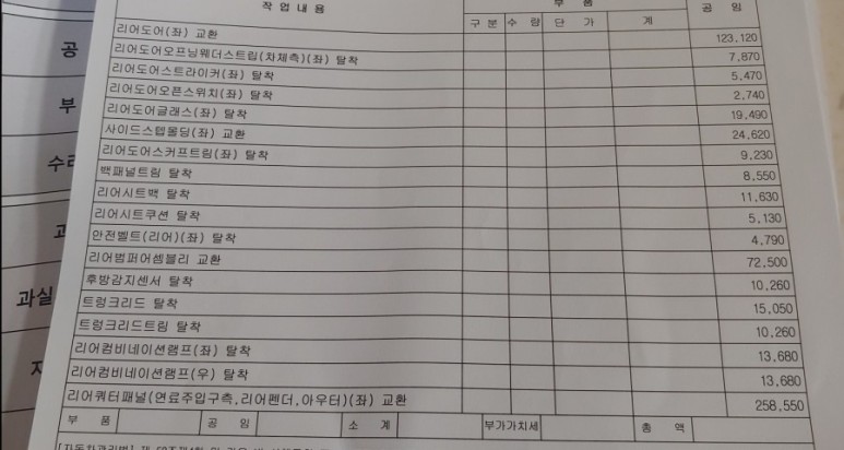 차 문도 바깥쪽만 교체하고 뒷유리창과 연결 부분은 끊고 해야 하는 시간이 오래 걸린다.함차 수리비는 어떻게 생겼는지, 290만원가량 들었다고 확인렌트는 차량 수령 후 바로 반납사고가 발생해 한 달 뒤 물건은 완료.