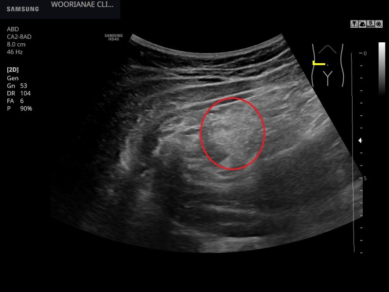 프로브에서 누르면서 압통 부위를 확인할 수 있지만 연골 부위 소견은 명확하지 않았다.