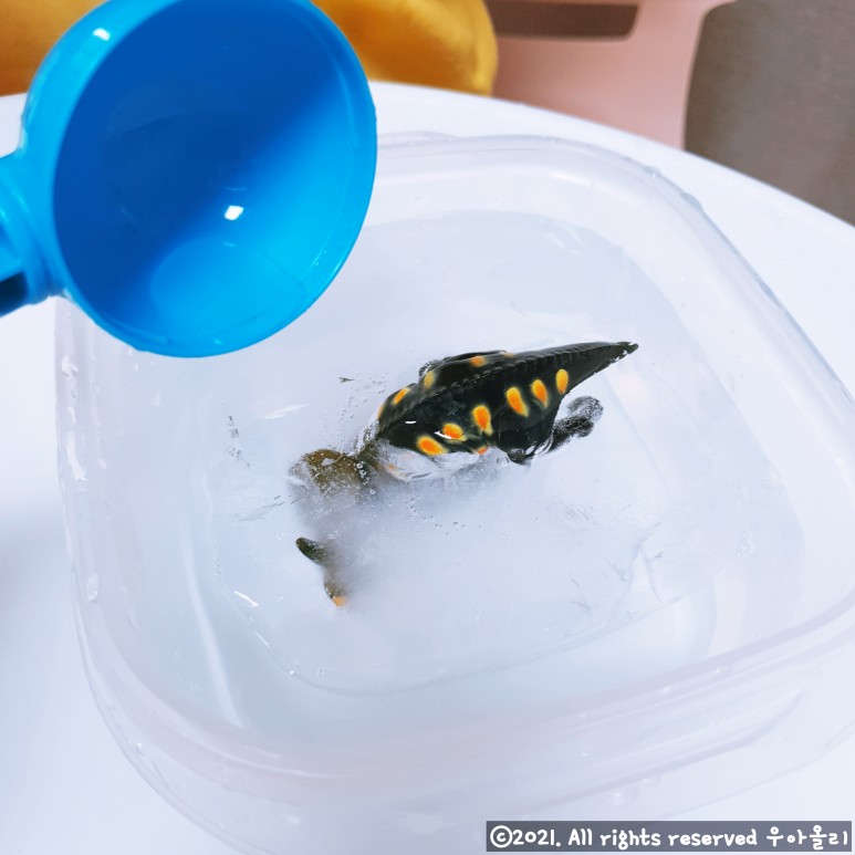 물도 준비해 주셨어요. 아직 힘을 많이 주지 않은 탓인지 아이 혼자 얼음을 깨는데는 이 물이 직접이었어요. (물조심!!)