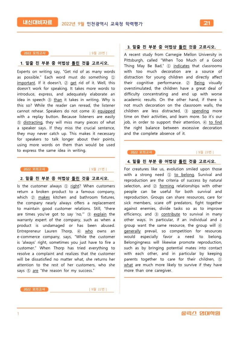 아래는 고등학교 1학년 2022년 9월 영어 모의고사 문제와 정답입니다.프린트해서 꼭 다시 풀어보죠. 첨부파일 고등학교 1호 2022년 9월 영어 모의고사.pdf 파일 다운로드