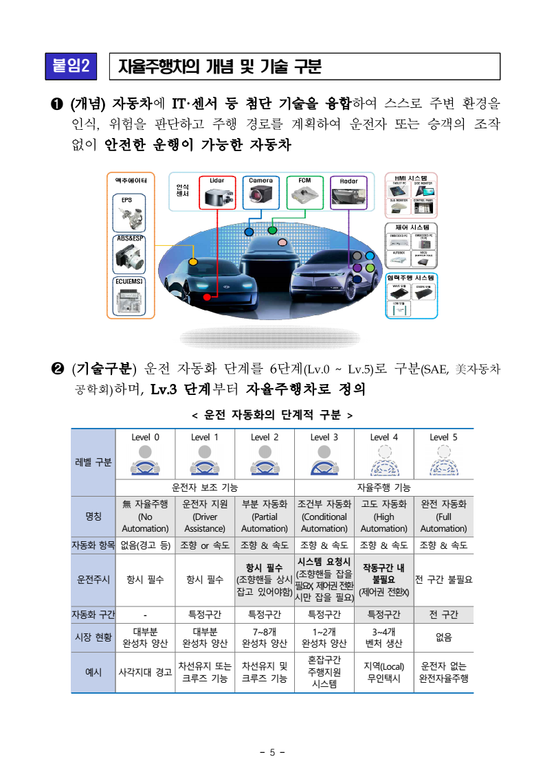 자율주행 기술개발 혁신사업은 ‘2027년 융합형 Lv4+ 자율주행 상용화 기반 완성을 목표로 올해부터 2027년까지 총 1조974억원이 투입되는 다부처 사업으로 차량융합 신기술, IICT 융합 신기술, 고 도로교통융합 신기술, ᄆ 創出서비스 창출 및 ᄃ 系 생태계 구축 등 5대 분야를 중심으로 총 84개 세부과제를 지원할 예정이며 올해 사업은 지난 1.15일 총 53개 신규 세부과제(총 851억원)를 이미 공고했으며 현재 사업수행자 선정을 위한 평가절차가 진행 중이다*