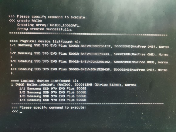 - Windows 설치 후에는 선택하고 세팅함으로써 Windows에서 다른 카드들도 전용 툴로 raid 구성이 정상적으로 이루어짐을 확인했다.단, uefi 로그 화면 뒤에 숨어 커널 기동 및 raid 셋팅 화면에는 넣지 않았다.