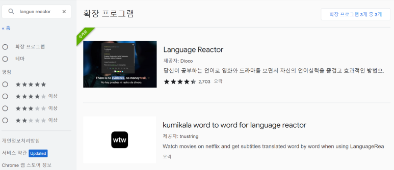 지난해 말 트위터에서 넷플릭스로 언어를 공부하는 방법을 봤는데, 한 번 시도해 보려니 그 정보글에 소개됐던 확장 프로그램인 랑캐리닝 with netflix를 찾을 수 없었다.