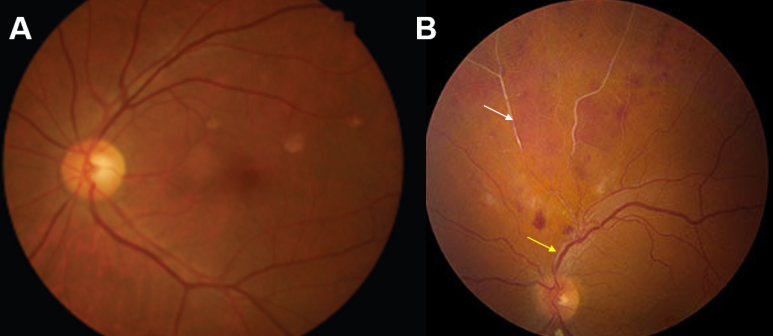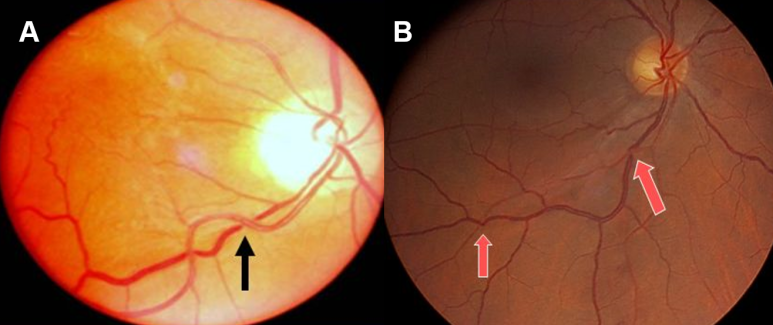 그림2.(A) 전반적인 소동맥의 혈관 직경 감소, (B) 동선 반사 (노란색 화살표), 은선 반사 (흰 화살표) ③ 소동맥-정맥 교차 부위 (A-V Crossing) 모양 변화 소동맥이 소정맥 전방에 놓이고 교차하는 장소에서의 공통 외막 (Comoon Adventitial Sheathoon이 Sheath)를 공유하고, ㉠ 소동맥의 방향에