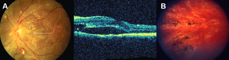 그림 6. (A) 국소망막색소 상피박리의 안저 사진과 OCT 사진, (B) Siegrist’s Streak #고혈압성 시신경병증 1) 악성 고혈압 → 유두부종 + 시신경 모세혈관 확장 + 유두 경계 부위 선상 출혈 + 황반부 삼출물 (그림7)