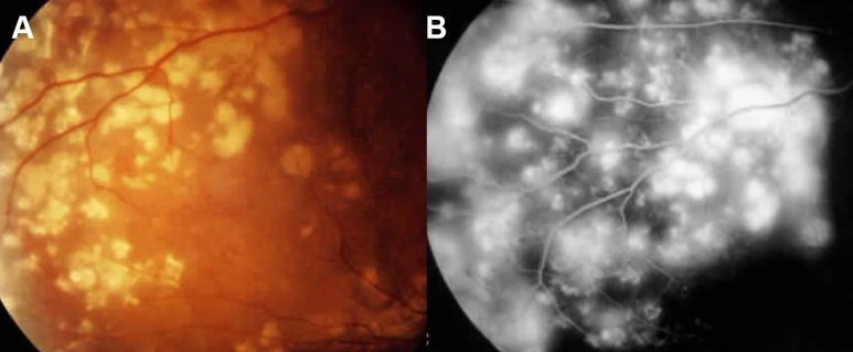 그림5. 급성기 Elschnig’s spot – (A) 안저사진: RPE경색에 의한 병변, (B) FAG상 과도한 형광누출 소견.3) 회복된 Elschnig’s spot : 주변부위의 색소감소 – 누출 (-)4) 국소적 망막박리 – 망막색소상피박리 : 맥락막모세혈관폐쇄 → 망막색소상피(RPE)의 기능부전 → 국소적 망막박리 또는 망막색소상피(RPE)의 기능부전 → 국소상막도