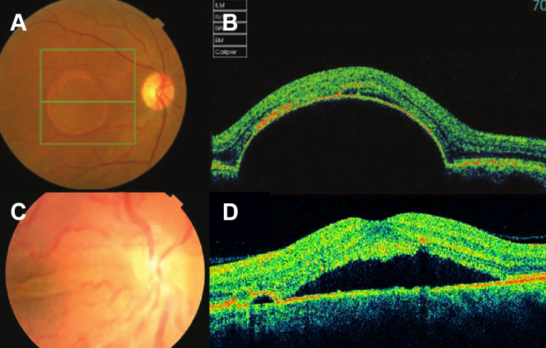 그림 1. 망막 색소 상피 박리-(A) 안 바닥 사진, (B) 광간섭 단층 촬영 (OCT) 사진, 삼출 망막 박리-(C) 안저 사진, (D) OCT 사진 4) 동맥 경화성 변화 : 나이에 따른 변화와 고혈압에 의한 변화가 복합적으로 작용 2. 안저 소견 # 망막 혈관의 변화 (Retinal)1) 소동맥 협착-가장 흔한 소동맥 협착(그림2-A): 만성 고혈압에서 더 분명하게 관찰 ② 소동맥의 혈관 직경 감소-소동맥 비(A/V ratio) 감소(cf. 정상은 2:3)