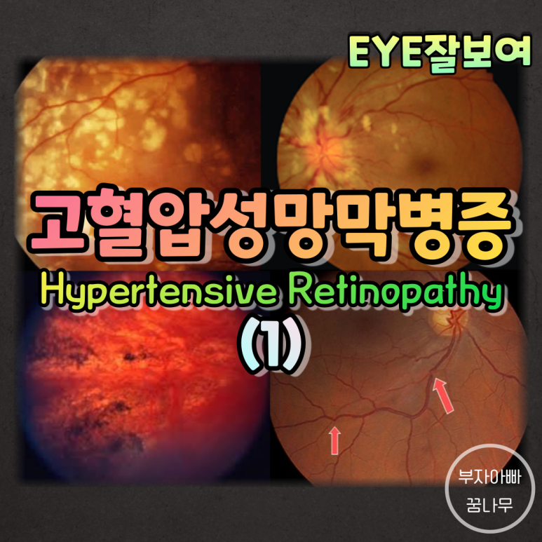 당뇨와 마찬가지로 고혈압도 망막에 심각한 합병증을 일으킬 수 있다. 고혈압의 유병률이 높아짐에 따라 고혈압 환자의 눈 검진에 대한 중요성이 점점 높아지는데, 오늘은 ‘고혈압성 망막병증(Hypertensive Retinopathy)’에 대해 공부해 보자.내용이 많을 테니까 두 편으로 나눠서 진행하려고 해.1) 어떻게 생겼나? – 병태생리1) 망막순환 자기조절(Autoregulation) – 혈압이 높아지면 일정한 혈류를 유지하기 위해 망막혈관이 수축된다.2) 지속적인 고혈압에서 망막 변화 대부분의 고혈압성 변화는 내측 또는 외측혈액망막(Inner Blood Retinal Barrier; BRB)을 파괴할 만큼 충분하지 않으나 오래 지속되면 문제를 일으킬 수 있다.① 내측혈액망막장벽(Inner BRB) 파괴 → 출혈, 면화반, 망막내지질 침착, 삼출물, 망막모세혈관 폐쇄 ② 망막소동맥의 경화성 변화 : 혈관과 직경의 감소 3) 망막혈성 변화 : 망막소동맥의 유전유괴사(Fibrinoid → 망막부분 파괴) * 혈관찰 안저혈관조영술