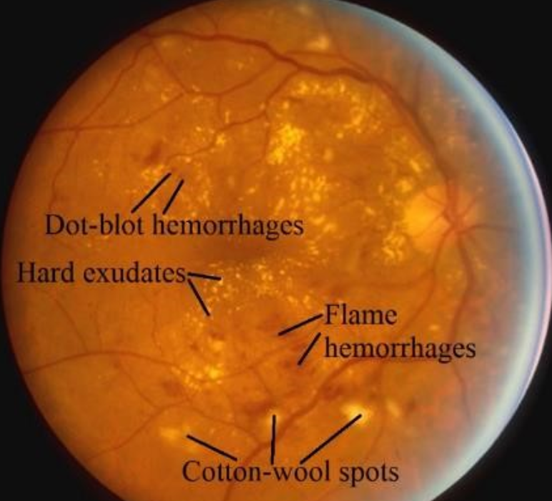 2) 망막부종과 지질침착 – 경성삼출물(Hard Exudates, 그림4) : 자기조절기능을 초과한 BRB 손상을 의미3) 면화반(Cotton Wool Spots, 그림4) : 신경섬유층의 국소적 허혈을 의미한다.