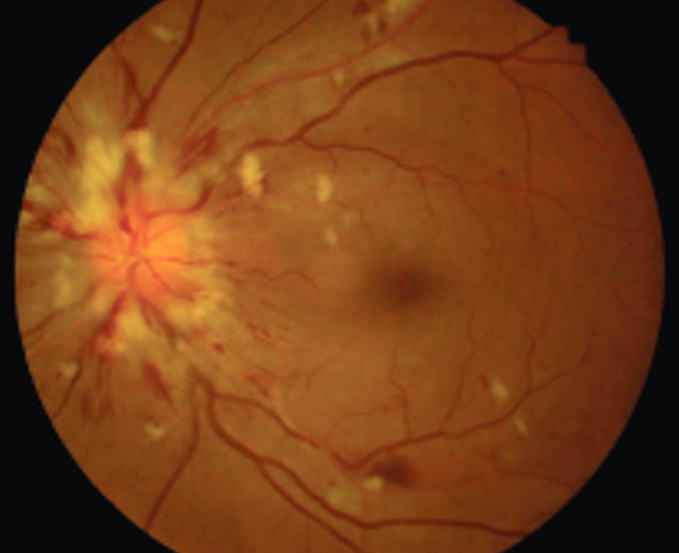 그림 7. 악성 고혈압 환자의 안저 소견 – 유두부종 + 망막 출혈 + 황반 부종이 관찰된다.2) 고혈압으로 인한 유두부종만으로는 시력에 영향을 주지 않지만 황반부를 침범하거나 맥락막 박리 등을 동반하면 시력저하 가능 고혈압성 망막병증이 어떻게 발생하는지, 눈에 고혈압의 흔적을 찾을 수 있는 소견에는 어떤 것이 있는지 살펴보았다.망막혈관의 변화 이외에도 여러 형태로 고혈압에 따른 변화를 보이므로 안저소견을 항상 익혔다가 바로 판단할 수 있어야 한다.