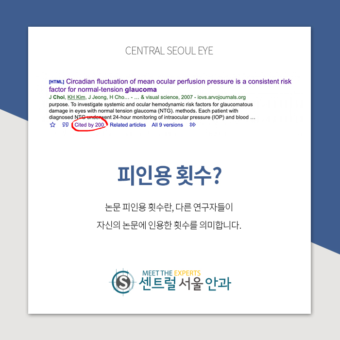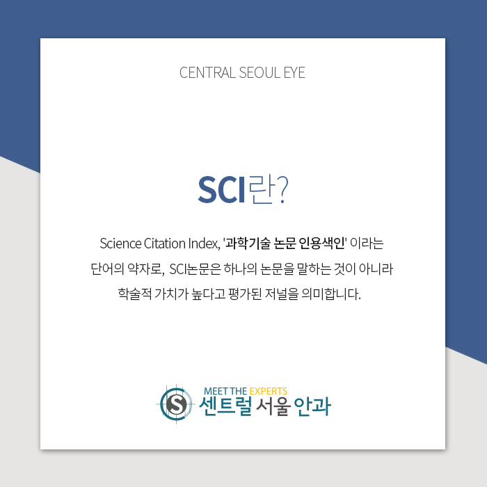 안녕하세요 센트럴서울안과입니다.센트럴서울안과 최재완 원장의 녹내장 논문이 SCI 국제학술지 피인용 횟수가 200회를 넘었습니다!여기서 SCI라는 단어는 Science Citation Index, ‘과학기술논문인용색인’이라는 단어의 약자로 SCI 논문은 한 논문이 아니라 학술적 가치가 높은 것으로 평가된 저널을 의미합니다. 간단히 저널에 대해 가치가 높은 것으로 평가된 논문을 SCI라고 부르는 것입니다.