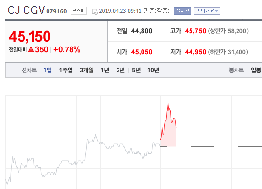 24일 개봉한 어벤져스4의 인기로 극장 CJ CGV 주가가 급등하고 있다.