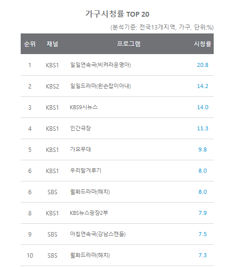 전국 수도권 2019.04.22가구 시청률 TOP20(분석기준: 전국 13개 지역, 가구, 단위:%) 순위 채널 프로그램 시청률 1 KBS1 일일드라마(지켜라 운명아) 20.82 KBS2 일일드라마(왼손잡이 아내) 14.23 KBS1 KBS9시 뉴스 14.04 KBS1 가요무대 9.86 KBS1 한국어 대결 8.06 SBS 월화드라마(해치) 8.08 KBS1 KBS 뉴스광장 2부 7.99 SBS 아침연속극(강남스포트) 7.5www.nielsenkorea.co.kr